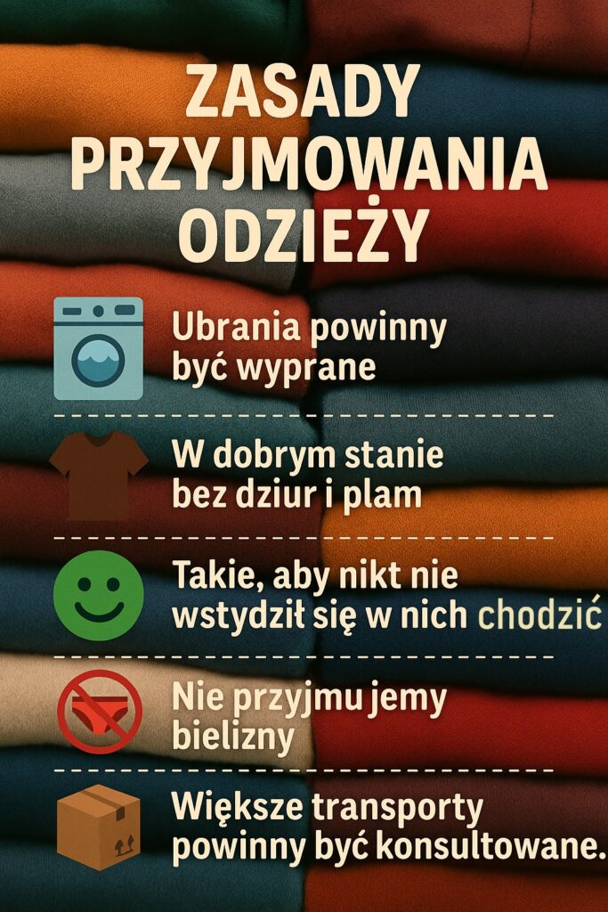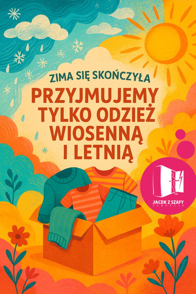 Przypominamy, że obecnie zbieramy wyłącznie odzież wiosenną i letnią. Bardzo prosimy, aby rzeczy, które do nas trafiają, były czyste i w dobrym stanie – takie, które sami z radością podarowalibyśmy komuś bliskiemu.