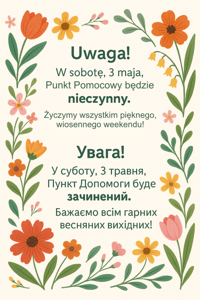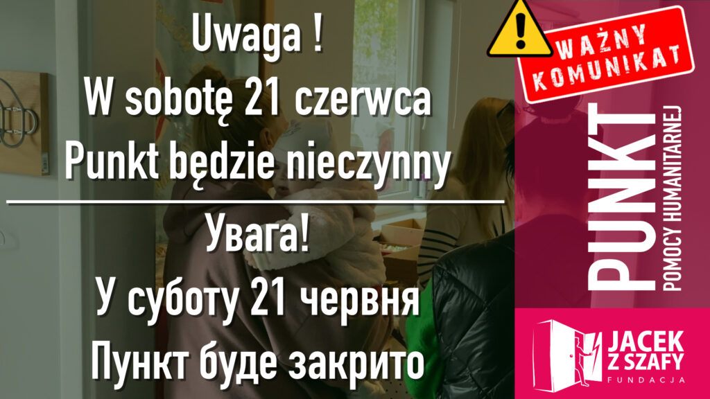Kochani! Zbliża się długi weekend na Boże Ciało, i tak jak wielu, my także planujemy trochę odpocząć i naładować baterie do dalszej pracy pomocowej. Dlatego informujemy, że w sobotę 21 czerwca Punkt Pomocy Humanitarnej będzie nieczynny. Przepraszamy za niedogodności i liczymy na wyrozumiałość, zarówno osoby nas wspierające, jak i tych, którzy przychodzą po pomoc.