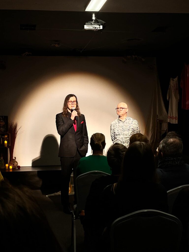 Przekazuję także moje osobiste podziękowania dla Natalia Romaniuk, która była odpowiedzialna za niesamowitą scenografię, Kinga Sielicka która była odpowiedzialna ze reżyserię światła, oraz Olha Hryhorash, która odegrała rolę Królowej Męczenników, zarówno w filmie, jak i wczoraj na scenie, nie zapominając o całej drużynie Teatr Emigrant, w szczególności Oldze Hryhorash, która jest pomysłodawczynią całego eventu, jego reżyserką i organizatorką.