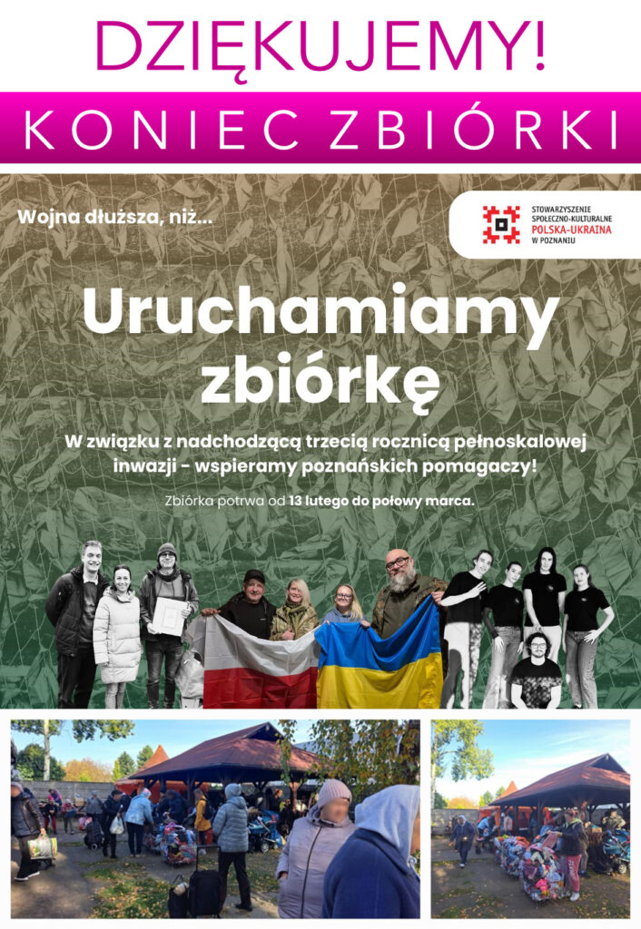W imieniu Fundacji Jacek z Szafy składamy serdeczne podziękowania Marii Andruchiw oraz Ukraińska Wiosna za zorganizowanie zbiórki na rzecz naszego Punktu Pomocy Humanitarnej podczas obchodów trzeciej rocznicy agresji Rosji na Ukrainę w Poznaniu.